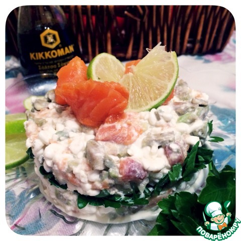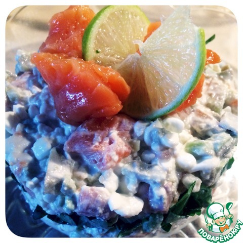 Извините за лирическое отступление, мы тут про ваш салатик, а салатик и правда, просто чудесный. Только я рыбку брала лосось в собственном соку, консервы. Тоже было вкусно.