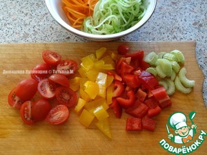 Перцы нарезать кубиками, черри - пополам, сельдерей - кусочками;