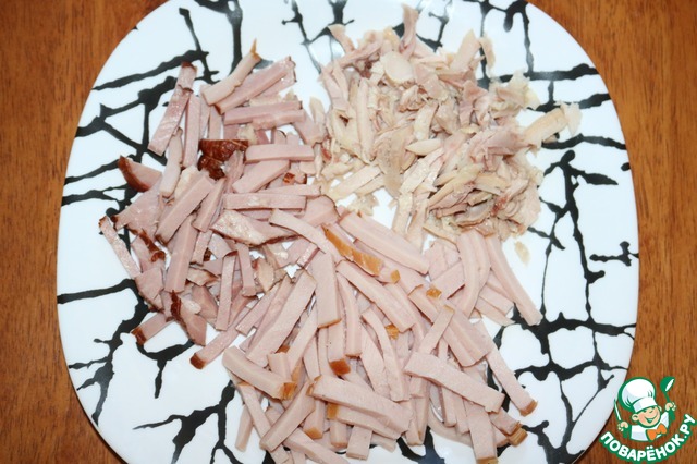 Все мясные ингредиенты нарезаем соломкой.