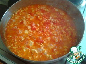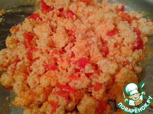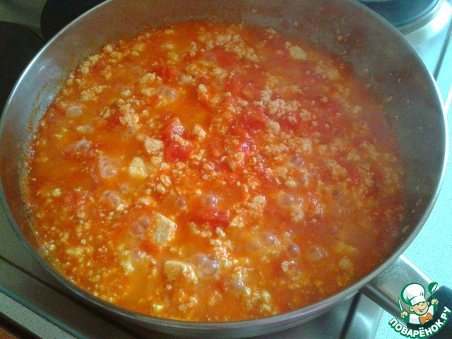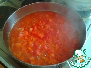 Добавить порезанные помидоры и тушить минут 5. Нужно, чтобы большая часть влаги выпарилась.