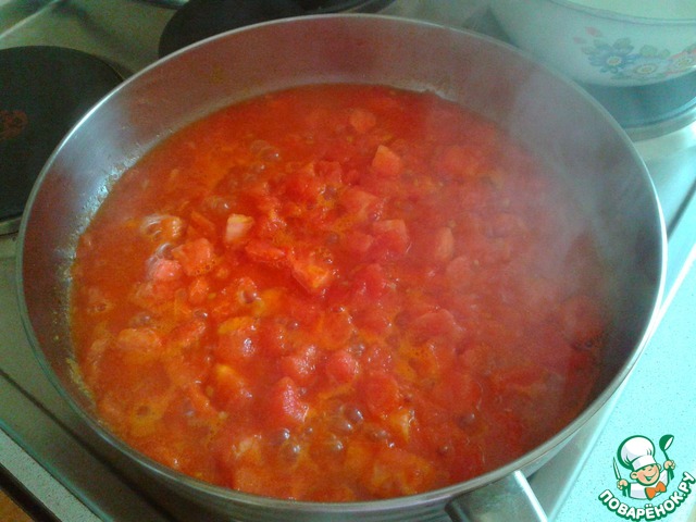 Помидоры очистить от кожицы (обязательно), предварительно опустив в кипяток. Порезать на кусочки.