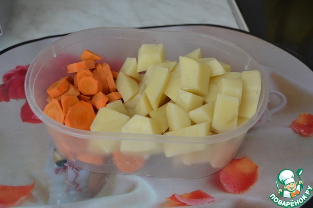 Очищаем картофель и морковь. Нарезаем кубиками картофель и кружочками морковь