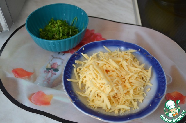 Натереть сыр на крупной тёрке, зелень мелко нарезать