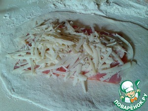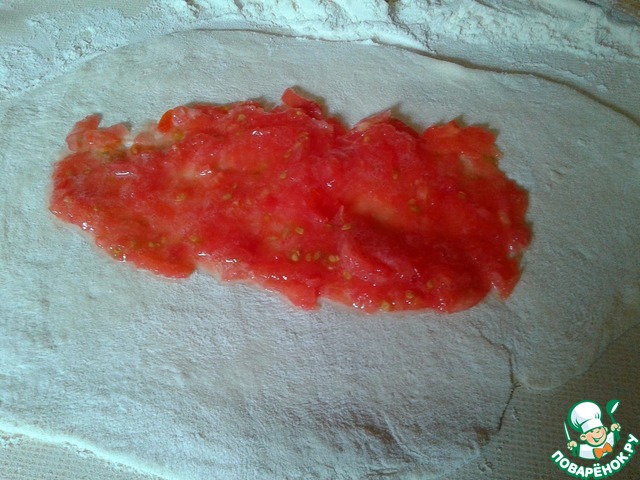 Берем комочек теста, раскатываем ( не очень тонко овал), выкладываем 1-2- ст. л. помидорной массы в центр. Сверху 2-3- кольца болгарского перца.