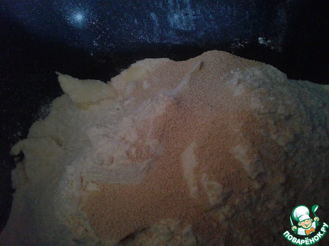 Замес теста доверяем или хлебопечке, или делаем вручную-масло растираем с мукой и солью. Дрожжи с сахаром разводим в теплом молоке. Объединяем и вымешиваем мягкое пластичное тесто, накрываем и ставим в теплое место на 1-1,5 часа.