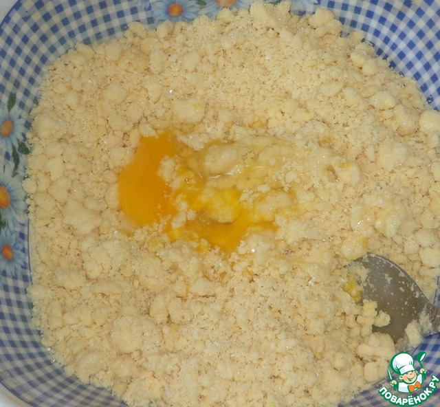 Соединяем сливочное масло с мукой, смешанной с разрыхлителем теста и растереть в крошку. -