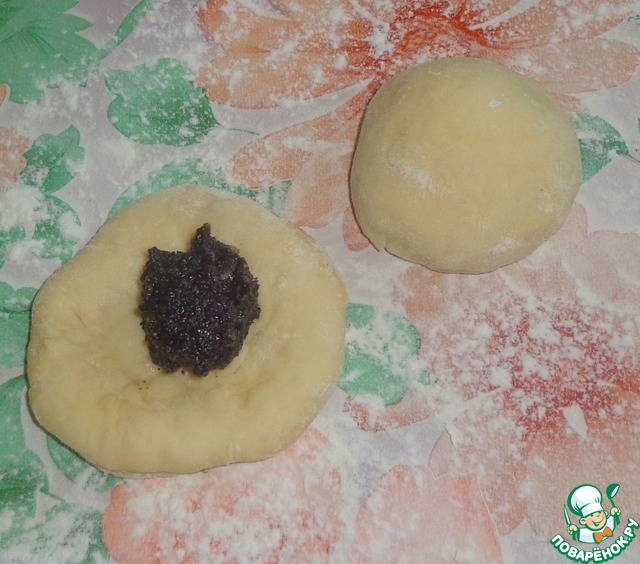 Кружочек немного растянуть руками и кладем немного маковой начинки. Защипываем и формируем шарик.