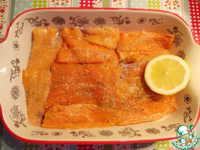 • Лосось нарезать небольшими кусочками, выложить в смазанную растительным маслом форму для запекания, сбрызнуть соком лимона, присыпать травами, оставить на 10 минут.