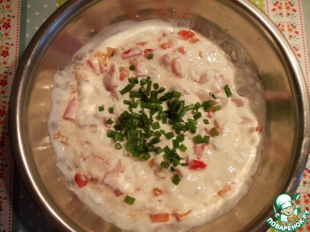 • Помидоры нарезать небольшими кубиками, зеленый лук нашинковать. Подготовленные помидоры и лук добавить в йогуртно-сырную смесь, поперчить, перемешать.