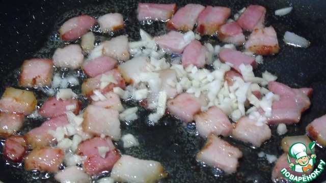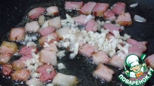 Бекон нарезать кубиками и обжарить на оливковом масле, в конце добавить мелко нарезанный чеснок.
