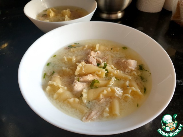 Взбить лимонный сок и желток, развести 2-3 ложками бульона и ввести в суп с готовой лапшой, продолжать нагревать, но не доводя до кипения, пока суп не побелеет и слегка не загустеет.