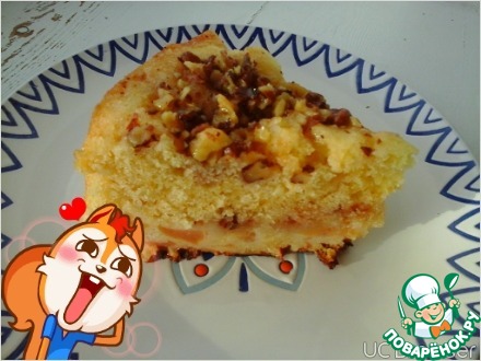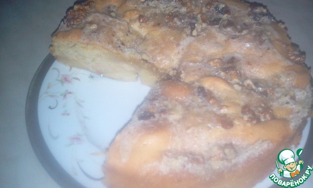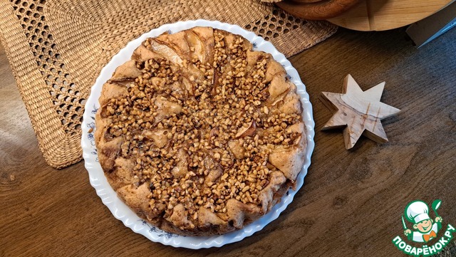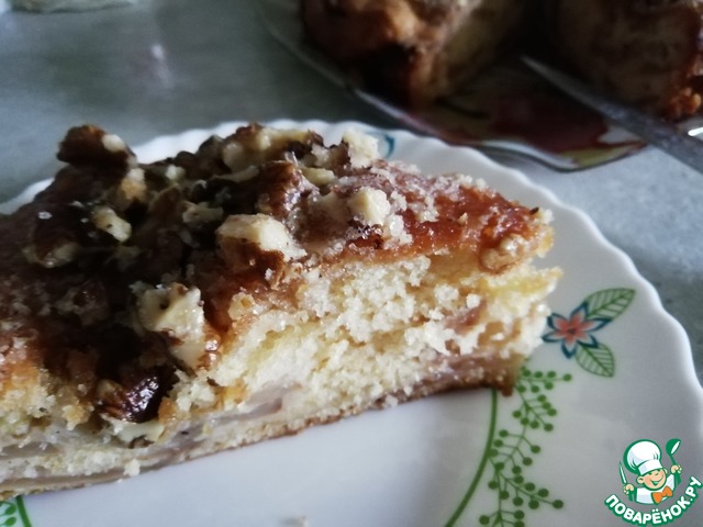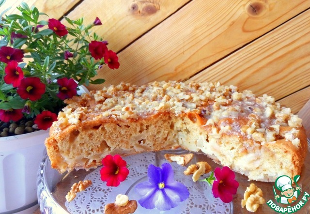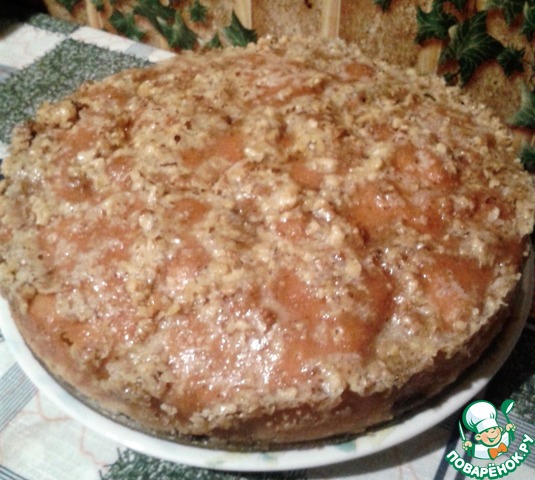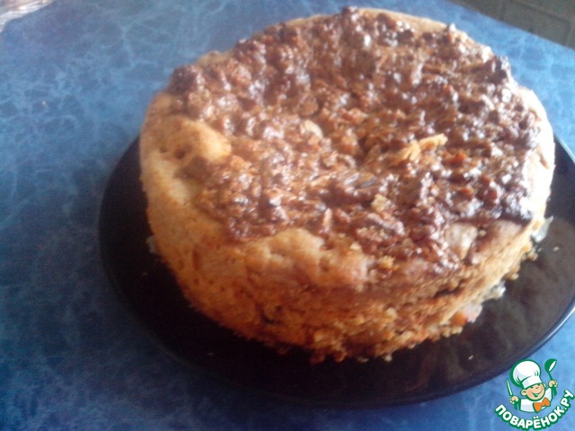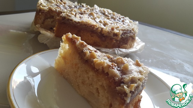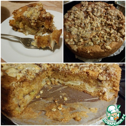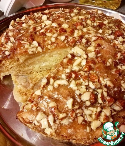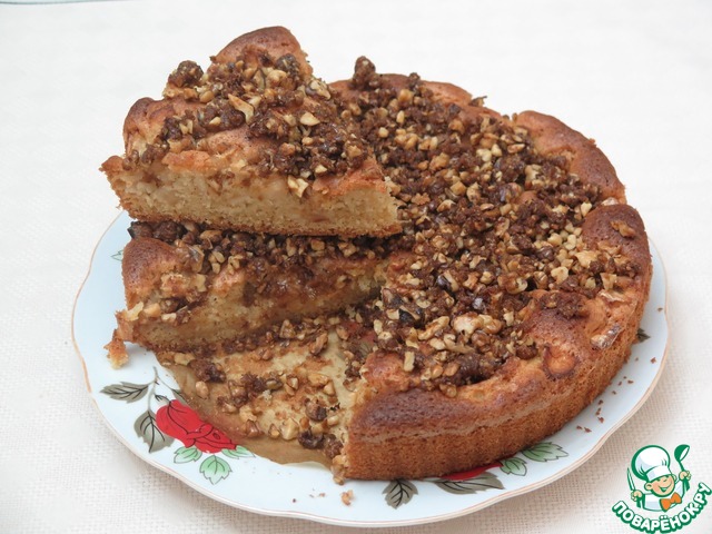 Пирог не сложный в исполнении, чем-то напоминает шарлотку, однако, верхняя карамельно-ореховая корочка делает его вкус неповторимым. Для любителей мокрых бисквитов. Рецепт из интернета от пользователя Оля.