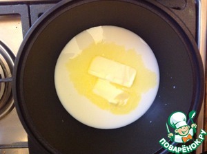 Начинка: сливки выливаем в кастрюльку, добавляем туда масло, ставим на огонь и нагреваем до тех пор, пока масло не растает