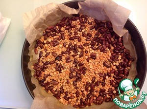 Выложим на тесто пекарскую бумагу, на нее насыпем горох или фасоль для того, чтобы тесто не поднялось - нам это не нужно (у меня и то и другое, т. к. по отдельности того и другого мне не хватило)