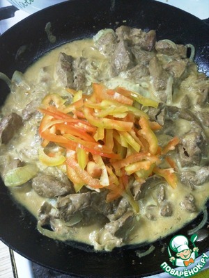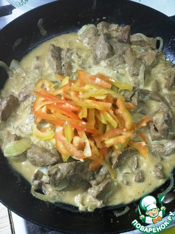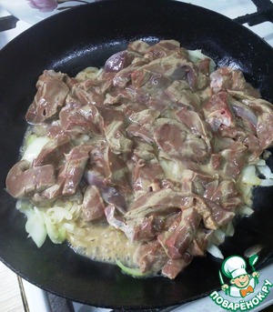 Добавляем печень вместе с соком. Тушим пару минут, помешивая.