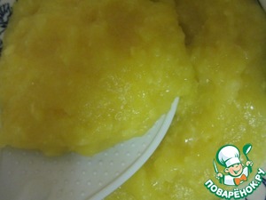 В кастрюльку вливаем апельсиновый сок с мякотью, добавляем 2 ст. л. без горки сахара и 2 ч. л. масла сливочного (не растопленного), как только закипело ждем 2-3 минуты и добавляем 1 ст. л. без горки муки. Варим постоянно помешивая до загустения. Снимаем и даем немного остыть.