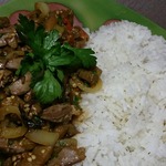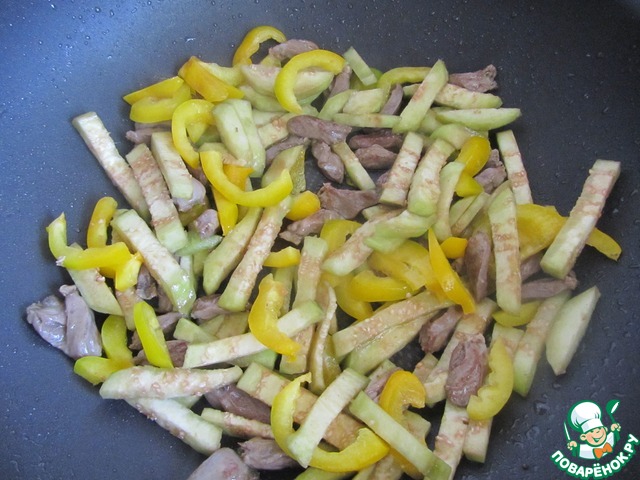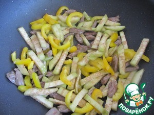 Затем добавить баклажан и перец и помешивая обжарить на сильном огне в течении 2 минут.