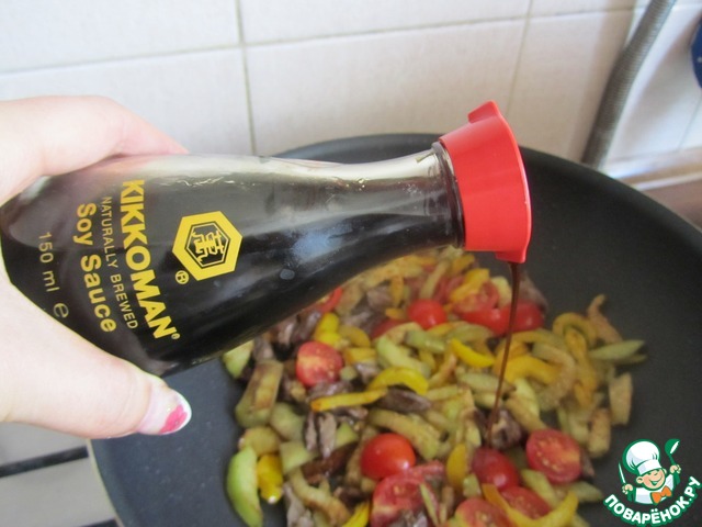 Добавить помидоры черри, соевый соус и горчицу. Все хорошо перемешать и жарить еще 1 минуту. Общее время приготовления салата не должно превышать 5 минут, иначе сердечки станут жесткими.