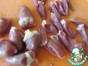 Куриные сердечки разрезать на 4 части.