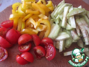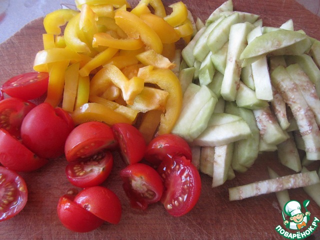 Баклажан очистить от кожуры и вместе с перцем нарезать соломкой. Помидоры черри разрезать пополам.