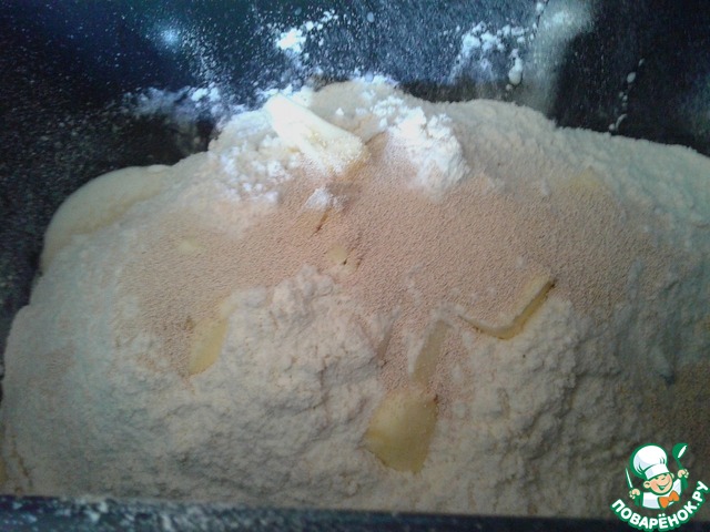 Замешиваем тесто: или в хлебопечке в режиме "тесто", или вручную- просеять муку, растереть с маслом, добавить сахар, соль, дрожжи. Влить простоквашу. Накрыть и поставить в теплое место на 1-1,5 часа.