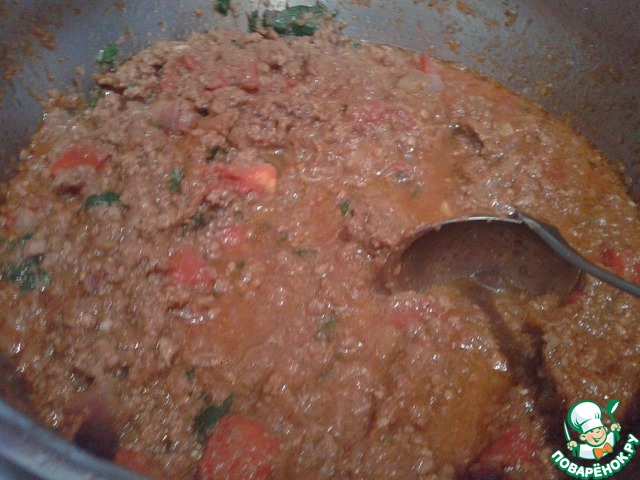 Для фарша: разогреваем оливковое масло, добавляем нарезанный кубиками лук, чуть обжариваем, добавляем фарш. Нарезанный чеснок, помидор, болгарский перец и петрушку отправляем в кастрюлю с фаршем. Добавляем томатный сок, соль, сахар, черный и душистый перцы, мускатный орех, провариваем до готовности фарша, Излишняя жидкость за это время должна выпариться.