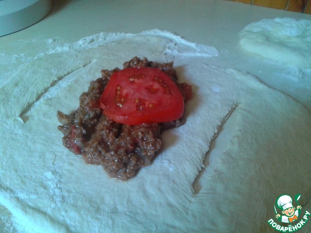 Каждую часть раскатываем не очень тонко в овал и делаем с двух сторон разрезы. В центр выкладываем 2 ст. л. фарша, затем 2 кусочка помидора.