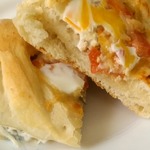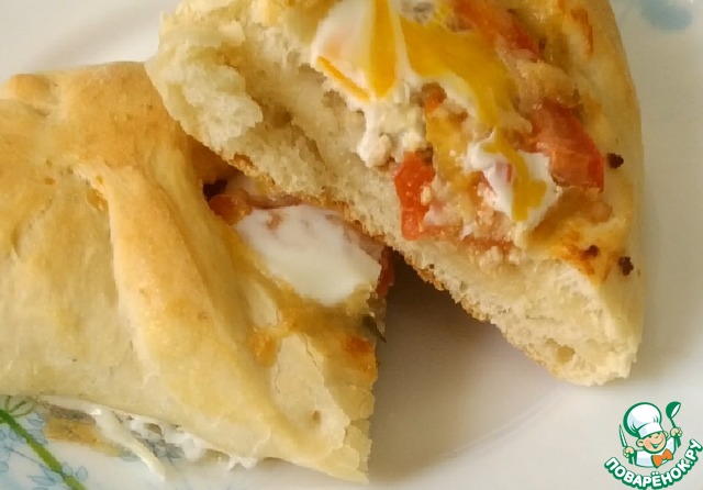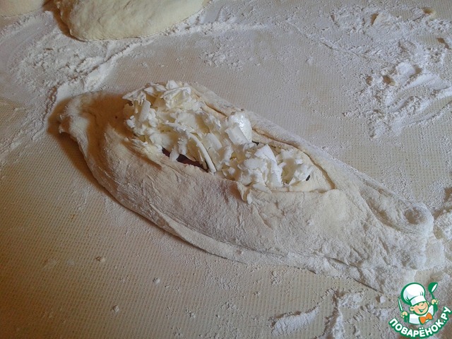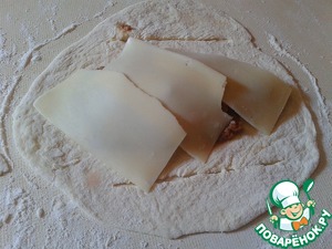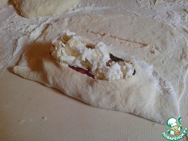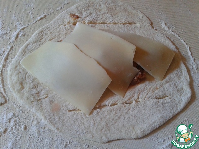 Сыр можно натереть на терке. Далее одну часть с разрезом загибаем кверху так, чтобы начинка была в разрезе.