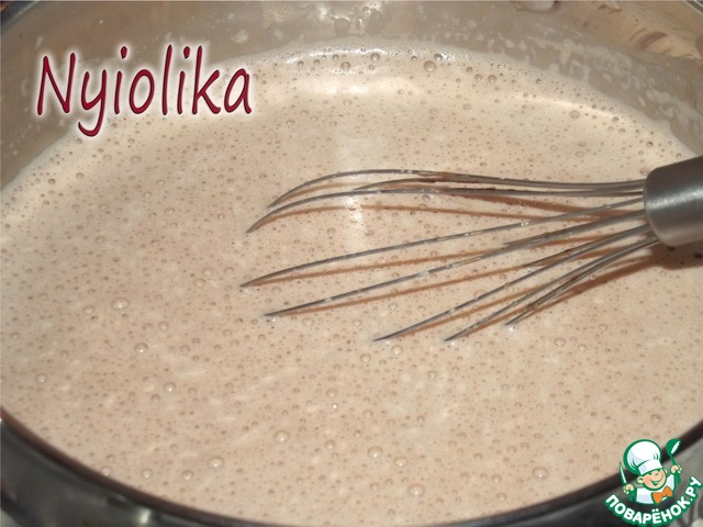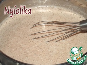 Небольшое количество уже горячего молока влить в сухую смесь, перемешать венчиком в однородную массу и влить в закипающее молоко.