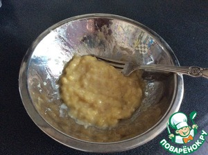 Банан разминаем вилочкой и добавляем к хлопьям.