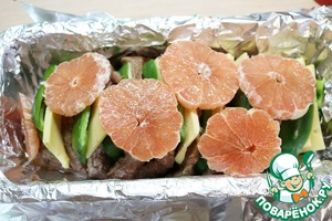 Сверху выкладываем кольца грейпфрута. Закрываем фольгой и отправляем в разогретую духовку до 200 градусов на 1 час.