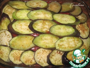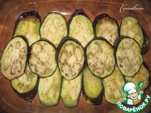 • В жаропрочную форму для запекания ровным слоем выложить половину баклажан.