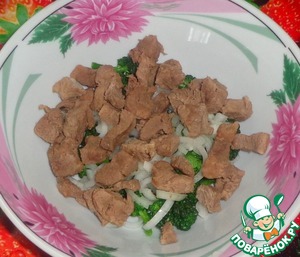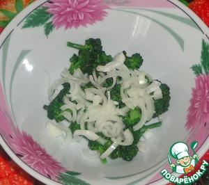 Репчатый лук очистить и порезать полукольцами. Лук залить горячей водой на 1 минуту, а затем прополоснуть холодной водой. Лук смешиваем с брокколи.