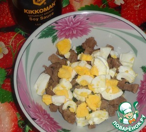 Отварное яйцо порезать кусочки и добавить в общую массу.