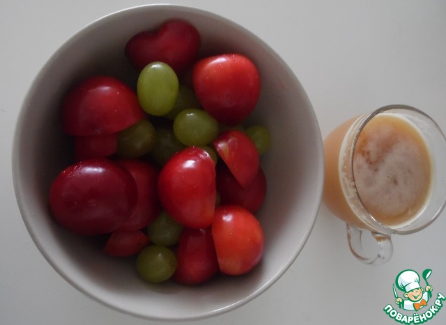 Выжать сок из слив и винограда. Фрукты помыть, из слив удалить косточки и разрезать пополам, виноград оставить целыми ягодами.