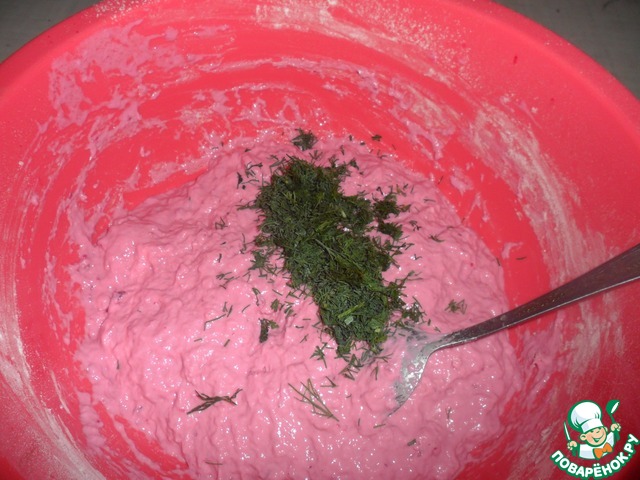 • Мелко режем укроп и добавляем в тесто, хорошо размешиваем.