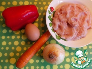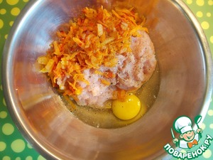 Смешать куриный фарш, овощную зажарку и яйцо, посолить, поперчить, хорошо вымесить.