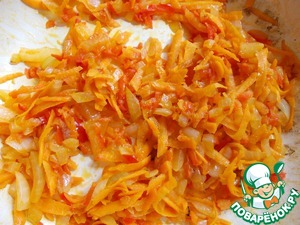 Лук мелко нашинковать, обжарить на растительном масле до золотистого цвета. Морковь и перец натереть на крупной терке, добавить к луку, обжарить 2-3 минуты.