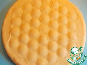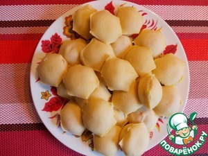Тесто разделить на 2 части. Раскатать в 2 круглых пласта (по форме пельменницы. Один плат разложить по пельменнице, сделать углубления, выложить в них начинку. Накрыть вторым пластом теста, раскатать скалкой.