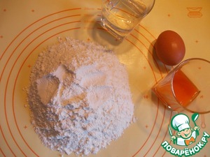 Муку просеять горкой, сделать в нем углубление, добавить в него соль, 1 яйцо и морковный сок. Замесить эластичное, не липнущее к рукам тесто, потихоньку вливая в него воду.