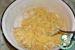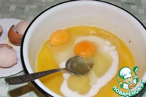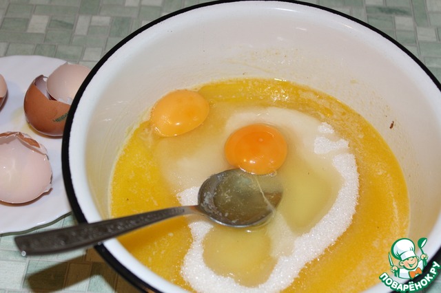 В миске соединила растопленное сливочное масло (остудить) с яйцами, сахаром и ванильным сахаром.