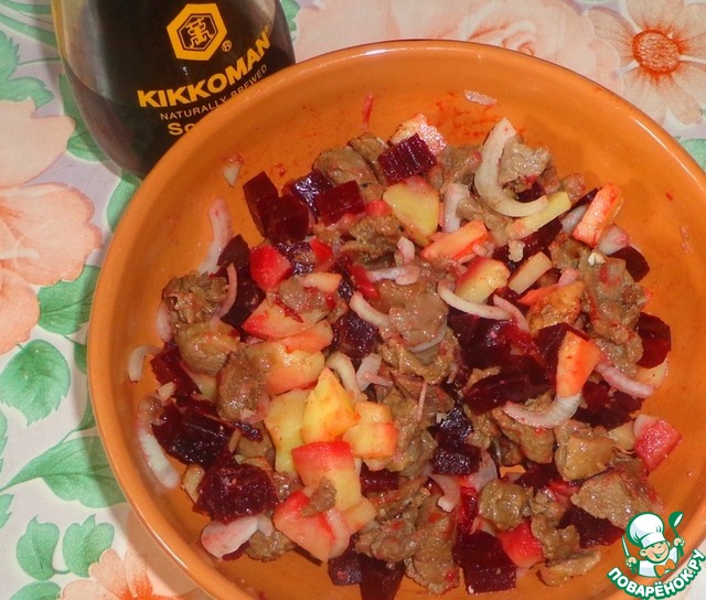 "Интрига", потому что на первый взгляд не скажешь, что салат сочетает в себе столь вкусные компоненты, которые спрятаны под тертым яйцом. Вкусный салат с соевым соусом и без заправки.