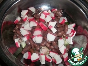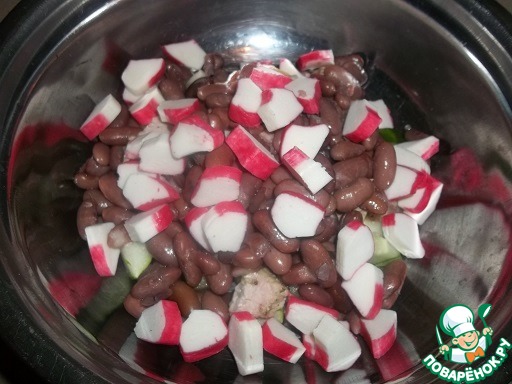 Добавить фасоль (у меня отваренная) и нарезанные крабовые палочки.