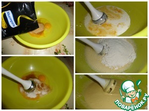 В чашку выкладываем яйца, сахар, соль, разрыхлитель теста. Хорошо взбиваем. Добавляем сливки. Перемешиваем. Всыпаем просеянную муку. Аккуратно перемешиваем. Тесто готово.