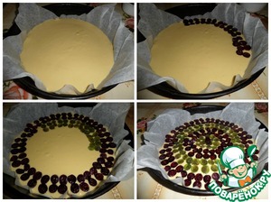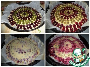 Тесто выкладываем на противень. Поверх теста выкладываем ягоды крыжовника, чередуя по цвету - красный, зеленый. Ставим в разогретую духовку. Выпекаем 15 минут при 150-170 градусах.