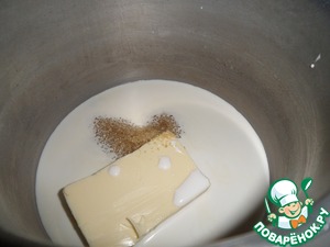 А пока готовим заливку для пирога. В кастрюлю наливаем сливки, кладем сахар и сливочное масло. Доводим до кипения, но не кипятим. Снимаем с огня.