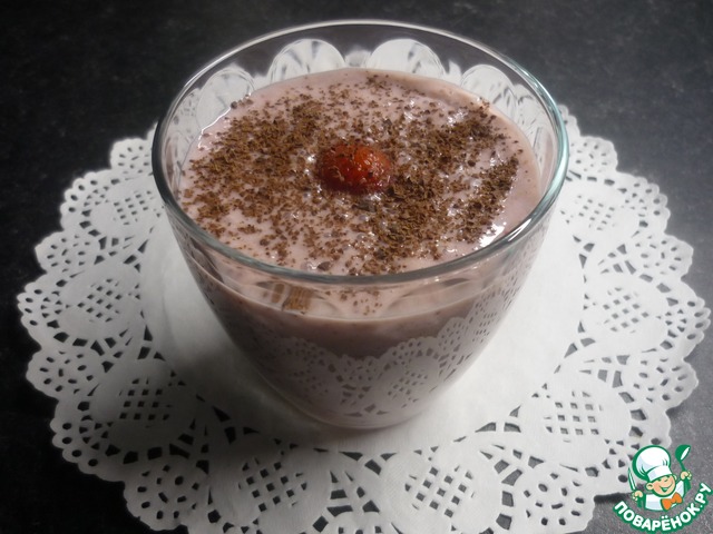 Разливаем по стаканам. Добавляем натертый шоколад и ягоды клубники. Подаем наш коктейль.