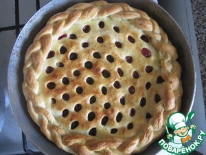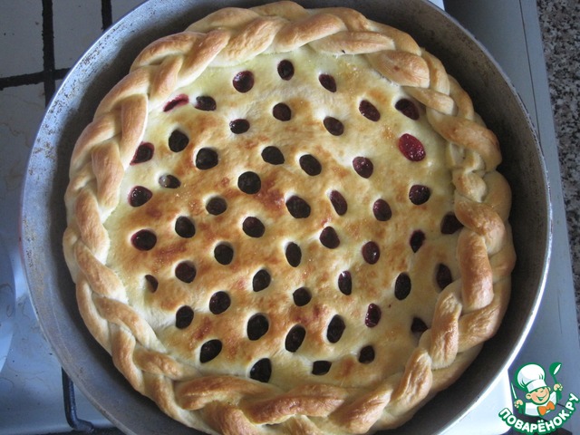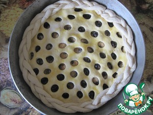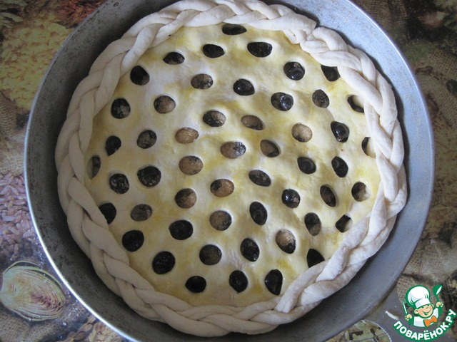 Раскатываем второй пласт, вырезаем отверстия, покрываем пирог, края защипываем. Смазываем яйцом