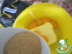 Готовим 2 бисквита. Масло комнатной температуры соединяем с желтками и сахаром (у меня ТМ Мистраль)