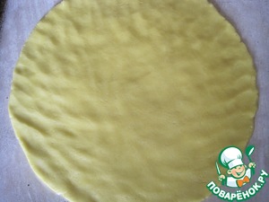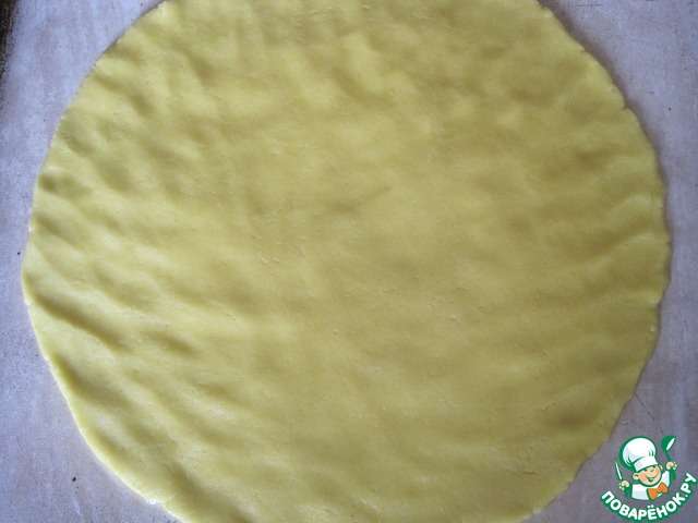 Тесто делим на 2 куска, раскатываем диаметром торта (у меня 28 см)